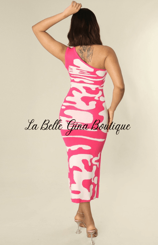 LINA ONE SHOULDER KNIT BODYCON MIDI DRESS.