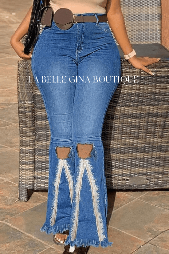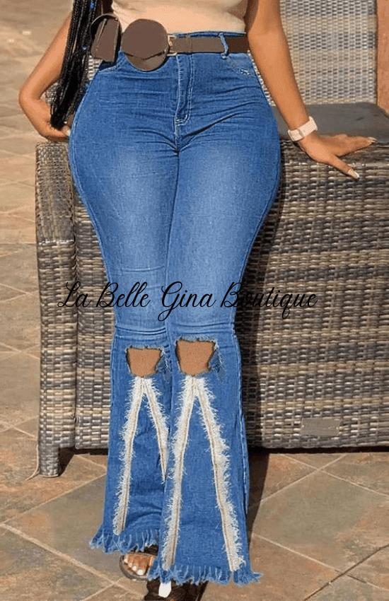 https://www.labelleginaboutique.com/collections/shop-al-womens-fashionZipper Fly cut out Raw hem flare leg Jeans.