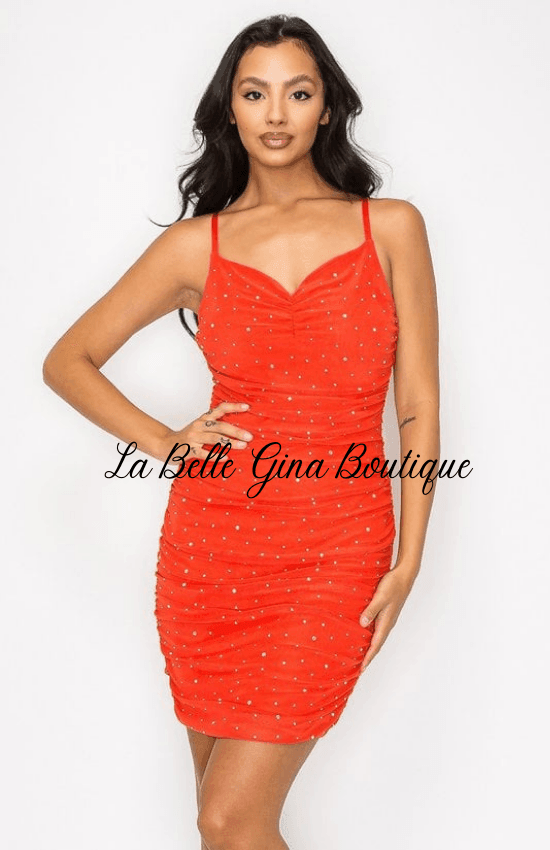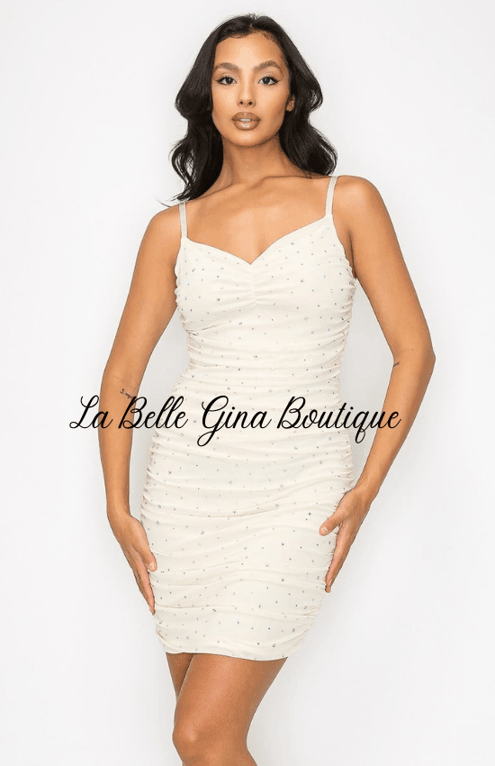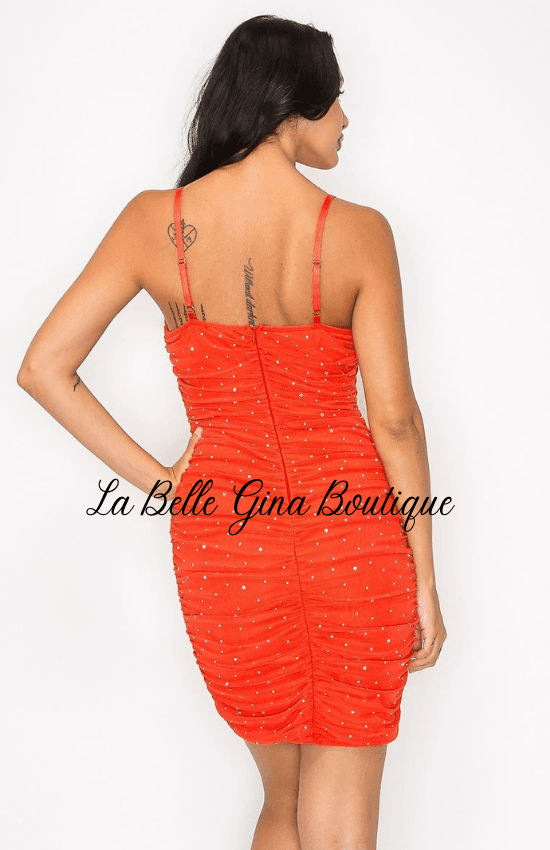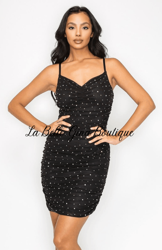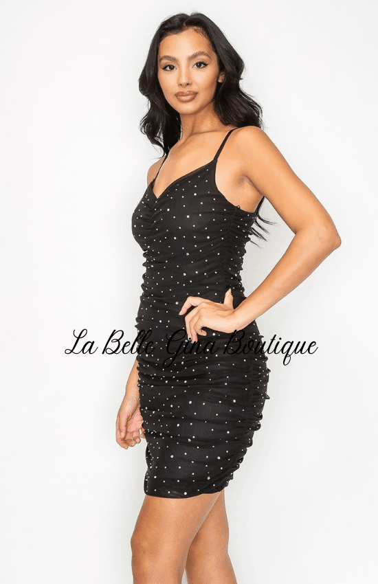 Marlie Rushed Mesh Mini Dress with Rhinestone V-Neck Adjustable Cami Strap