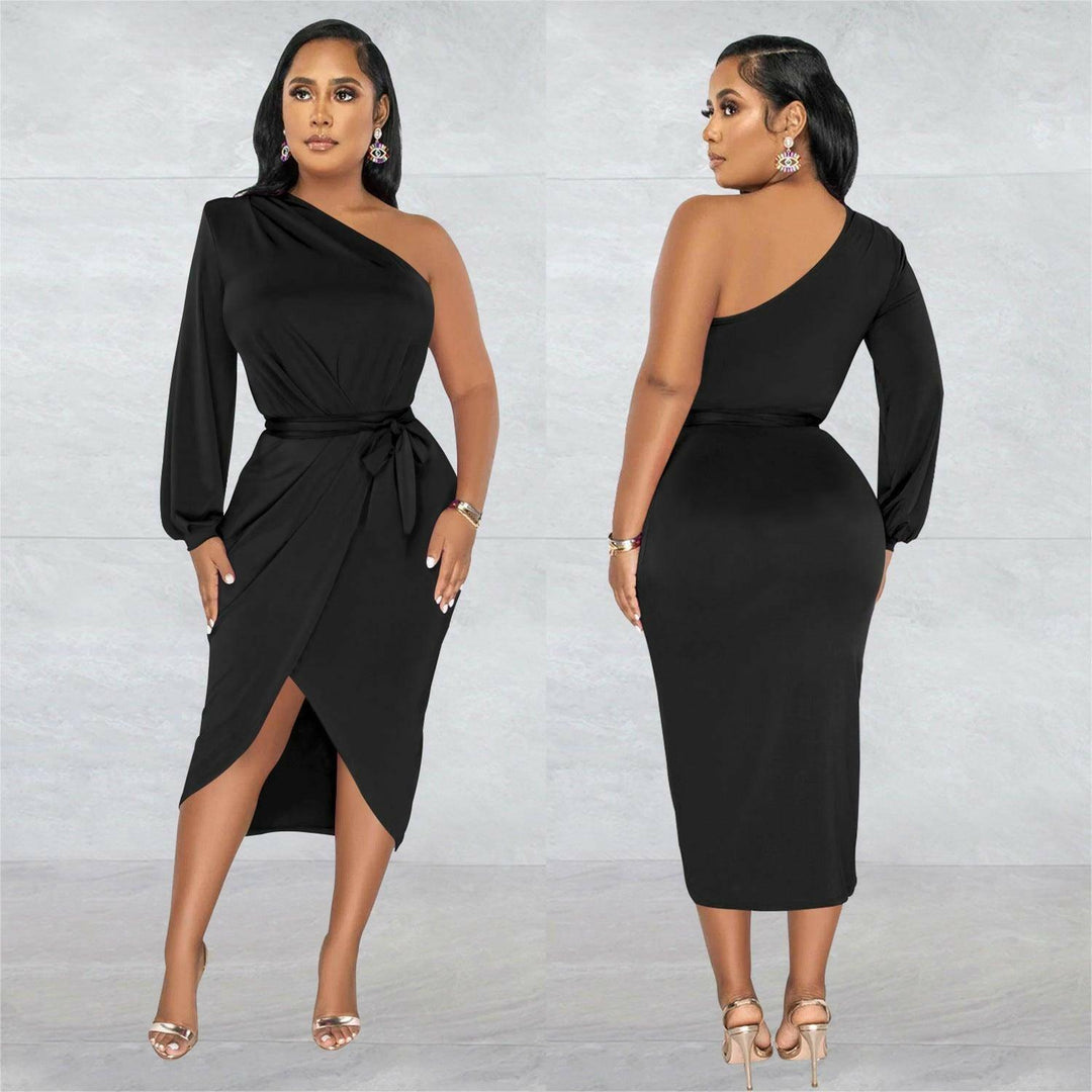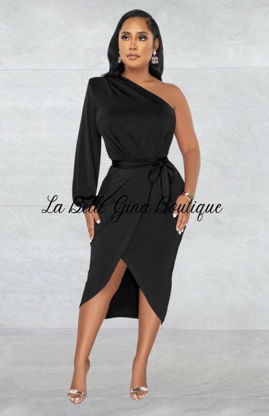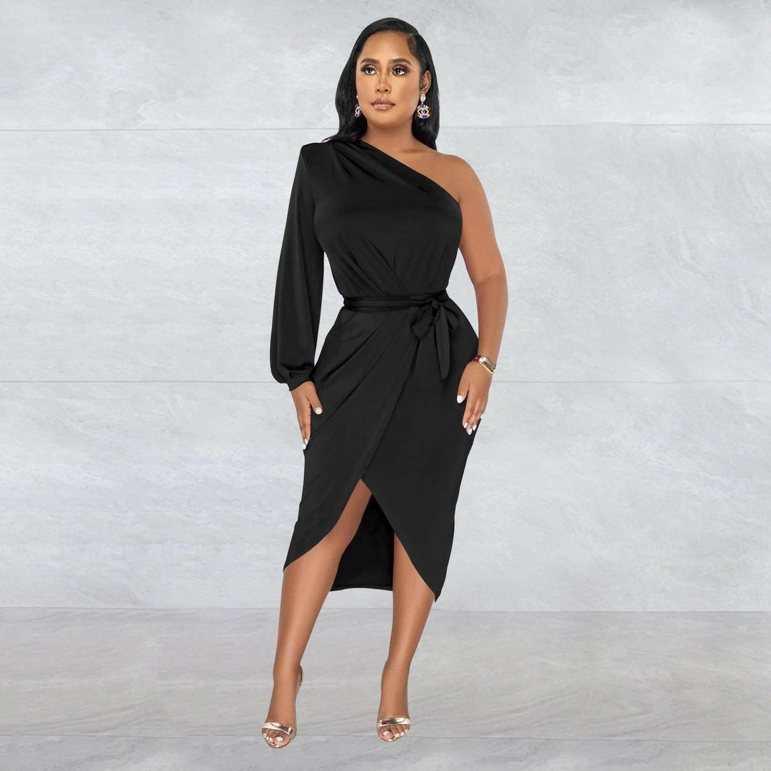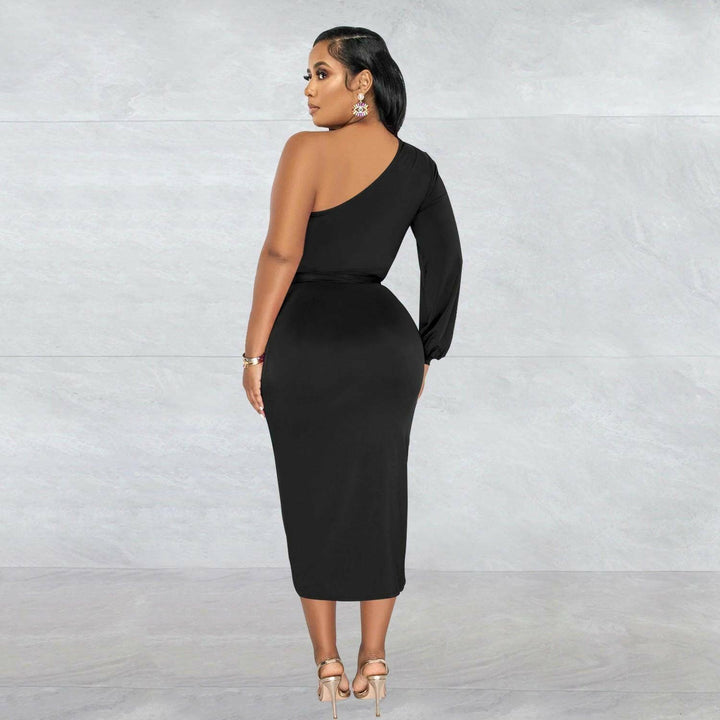 Marthe Single Sleeve Diagonal Long Skirt Dress-Black - La Belle Gina Boutique