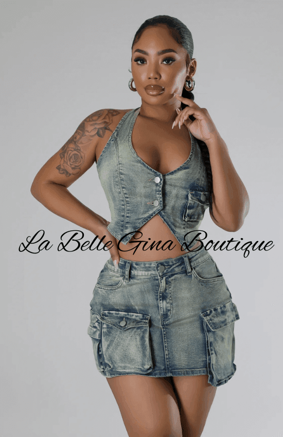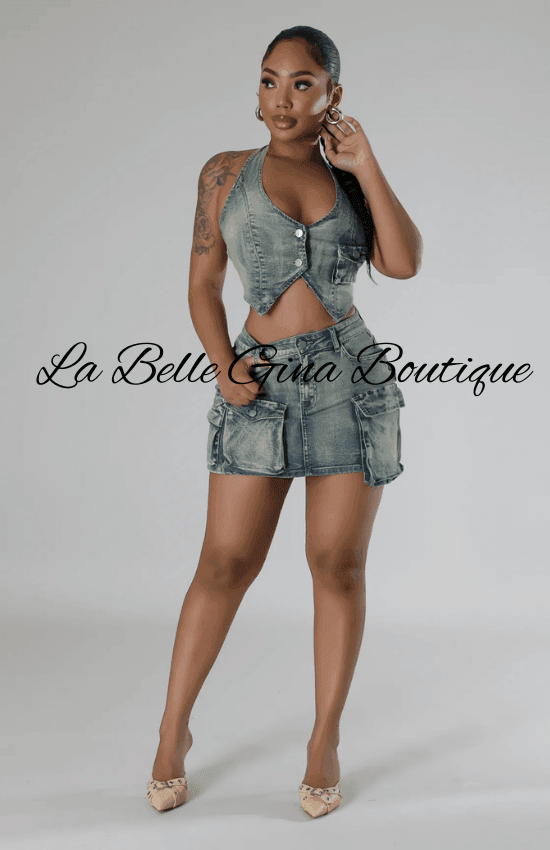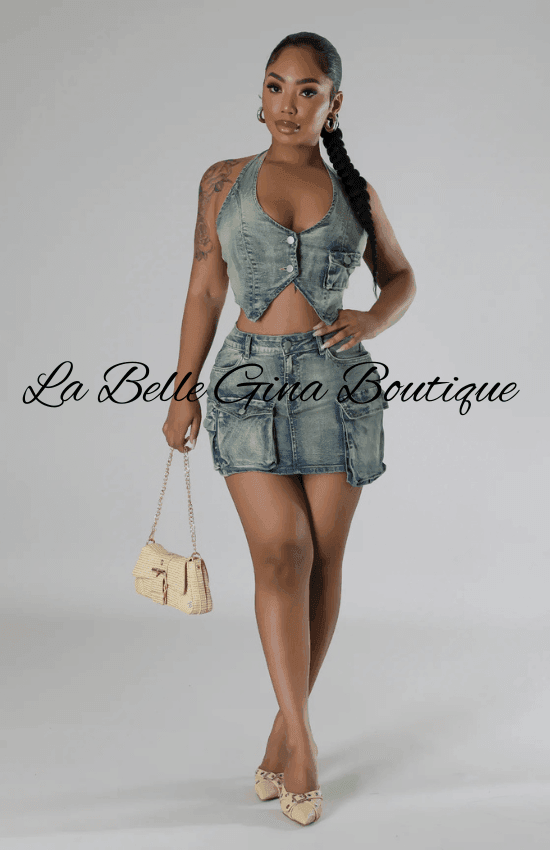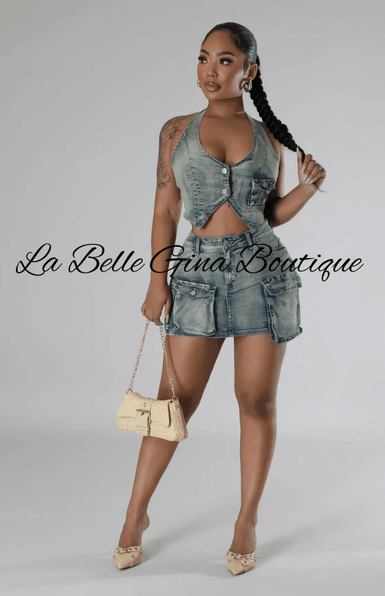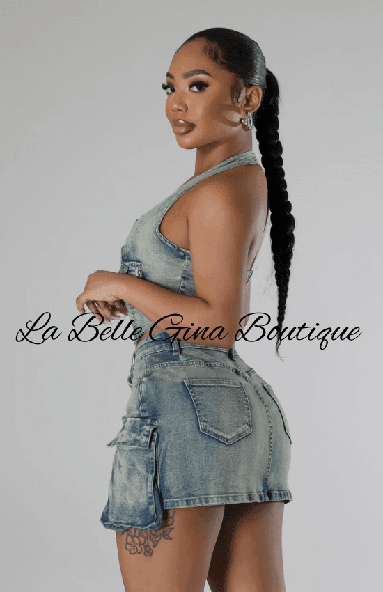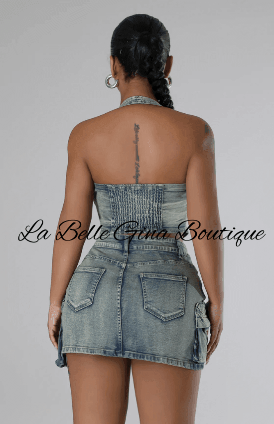 Megan Halter Neck Bra Top and Mini Skirt Set-Denim