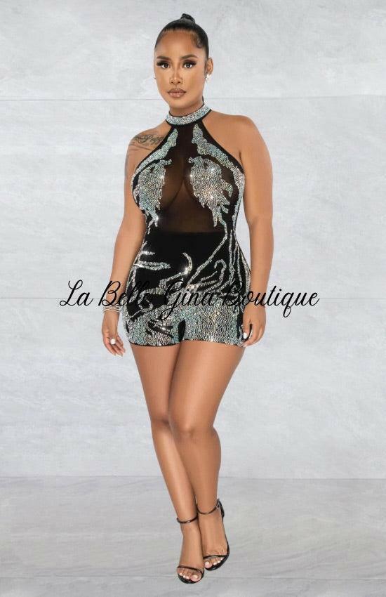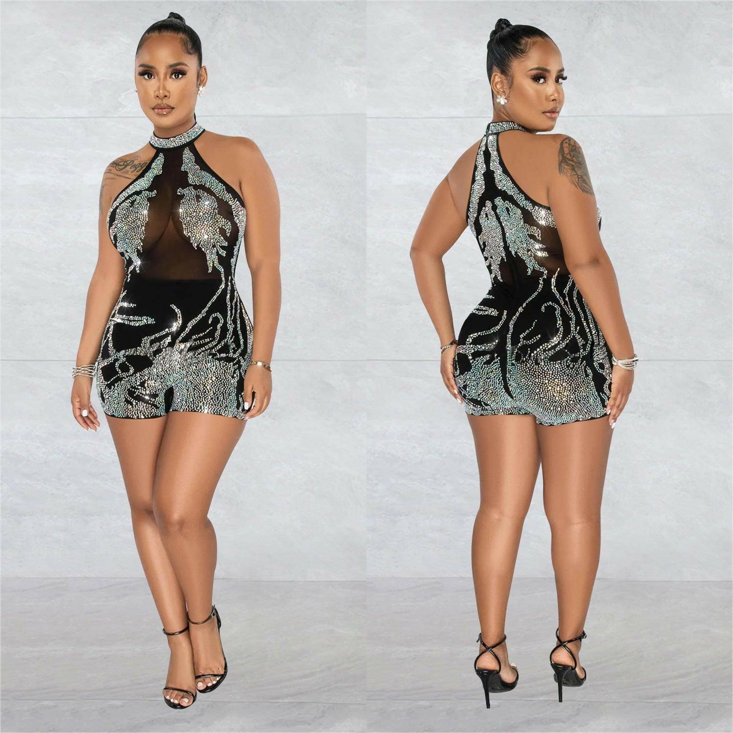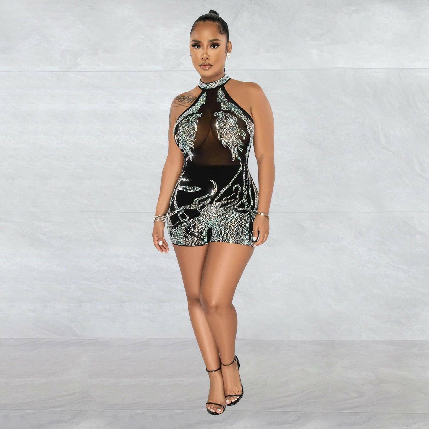 This Sexy sleeveless short  jumpsuit black tight-fitting mesh hot drill.See-through nightclub romper