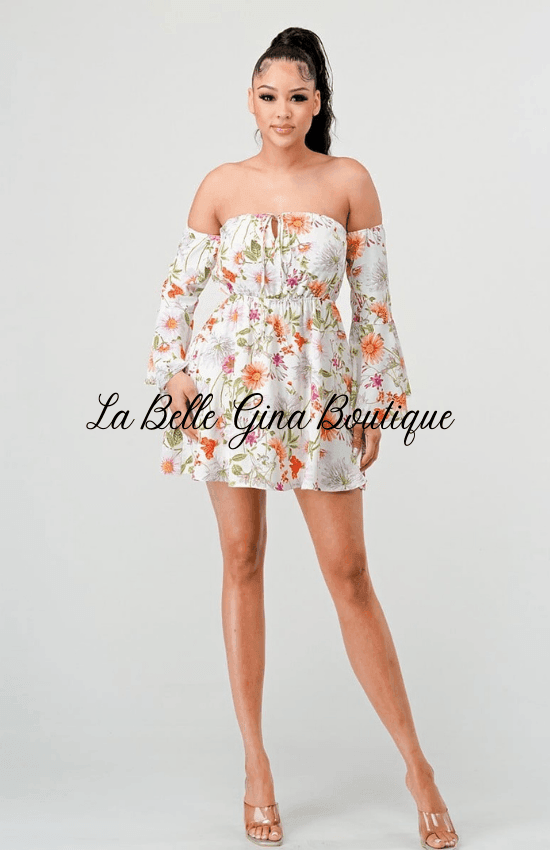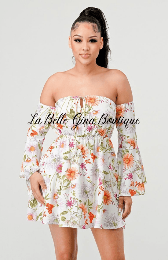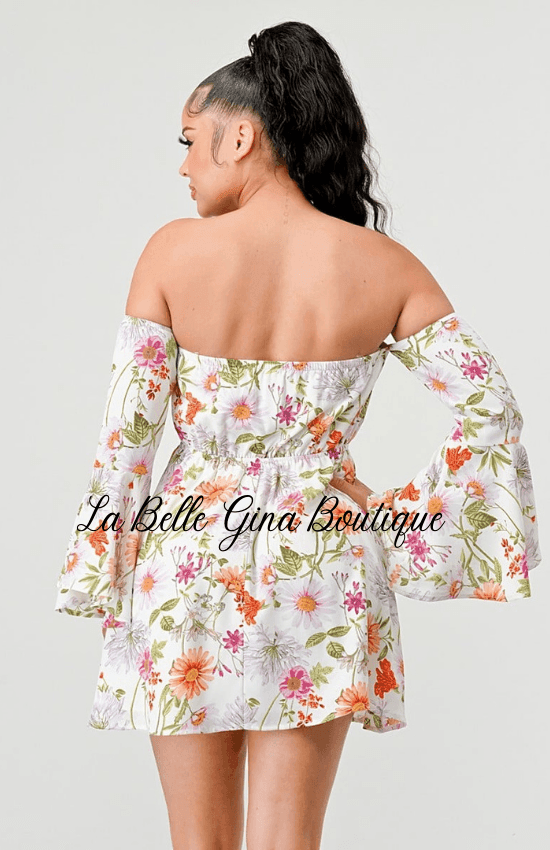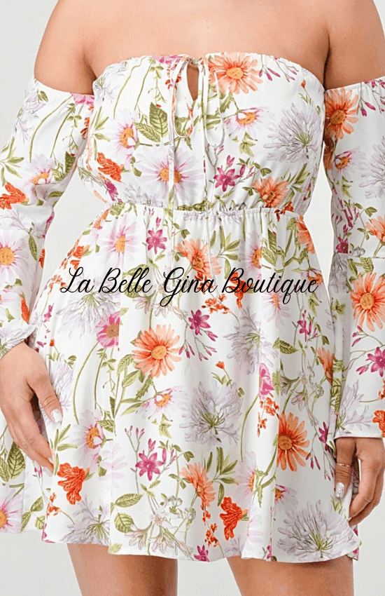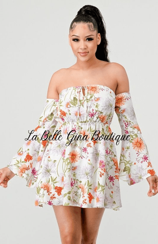 Introducing the Mya Floral Off Shoulder Mini Dress: embrace elegance with its bell sleeves, keyhole detail, and flattering fit flare silhouette. Perfect for any occasion!