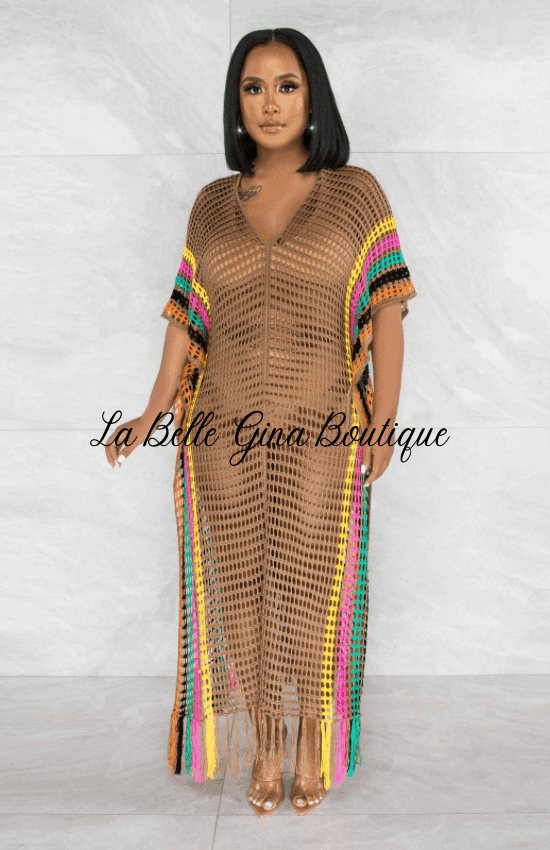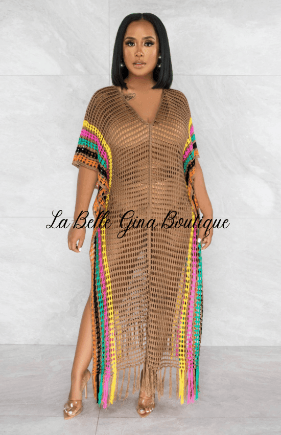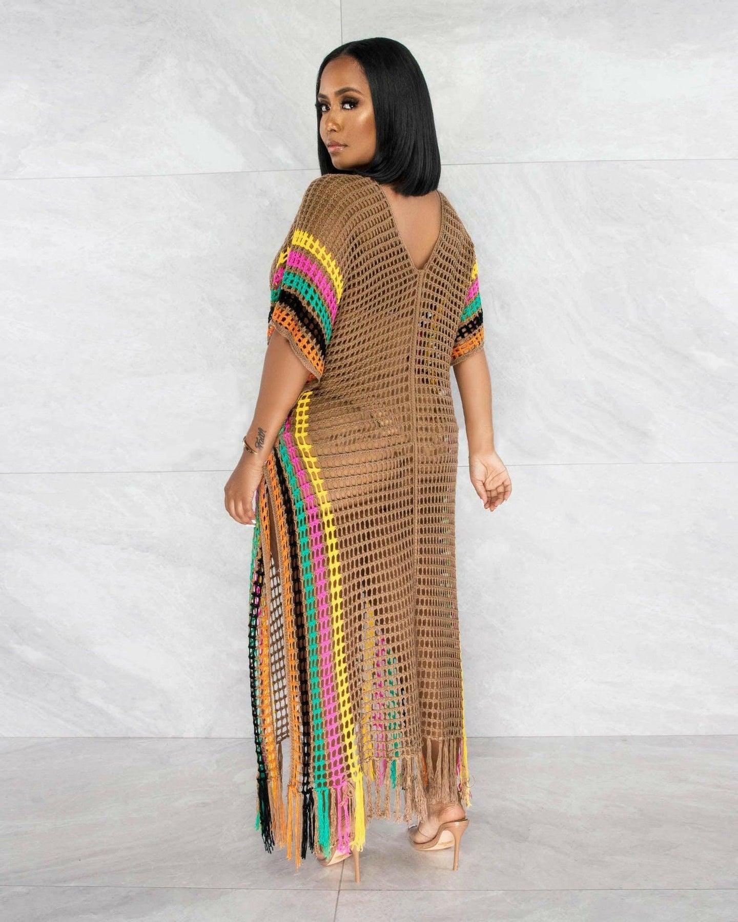 This Summer Ladies Sexy Crochet Knitting Tassel Colorblock Beach Long Dress Design Made Of High Quality Material. It Is a Must-Have Item For Islander Days.You Will Find Wide Range Colors, Prints, And Designs Women Beach Dresses With La Belle Gina Boutique - Crochet, Knitting, Chiffon, Print, Mesh, Fishnet, Bohemian Cover-Ups.