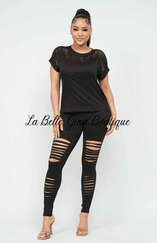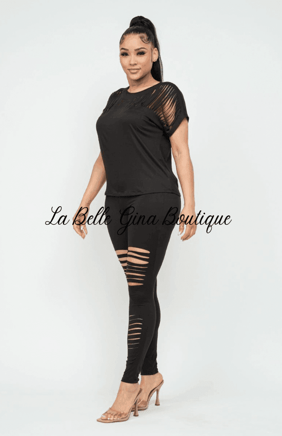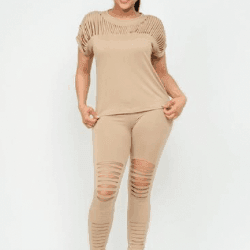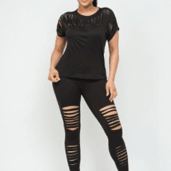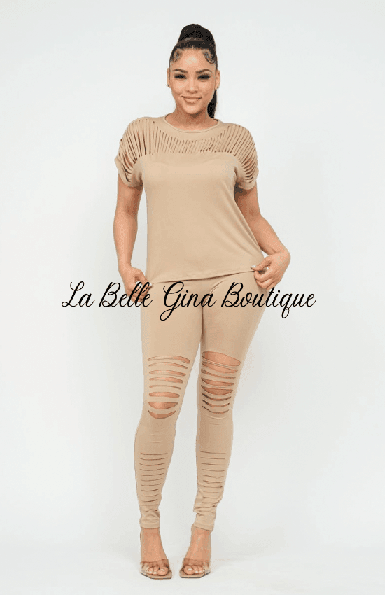 Description: Brushed Dty Solid Round Neck Front Laser Cut Detail Loose Fit Short Sleeve Shirts Top And Front Laser Cut Detail Leggings Set