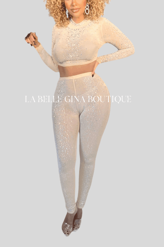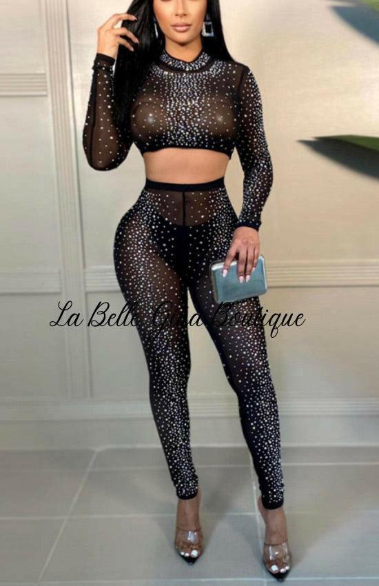 NELLE mesh sheer rhinestone crop top leggings matching set