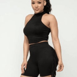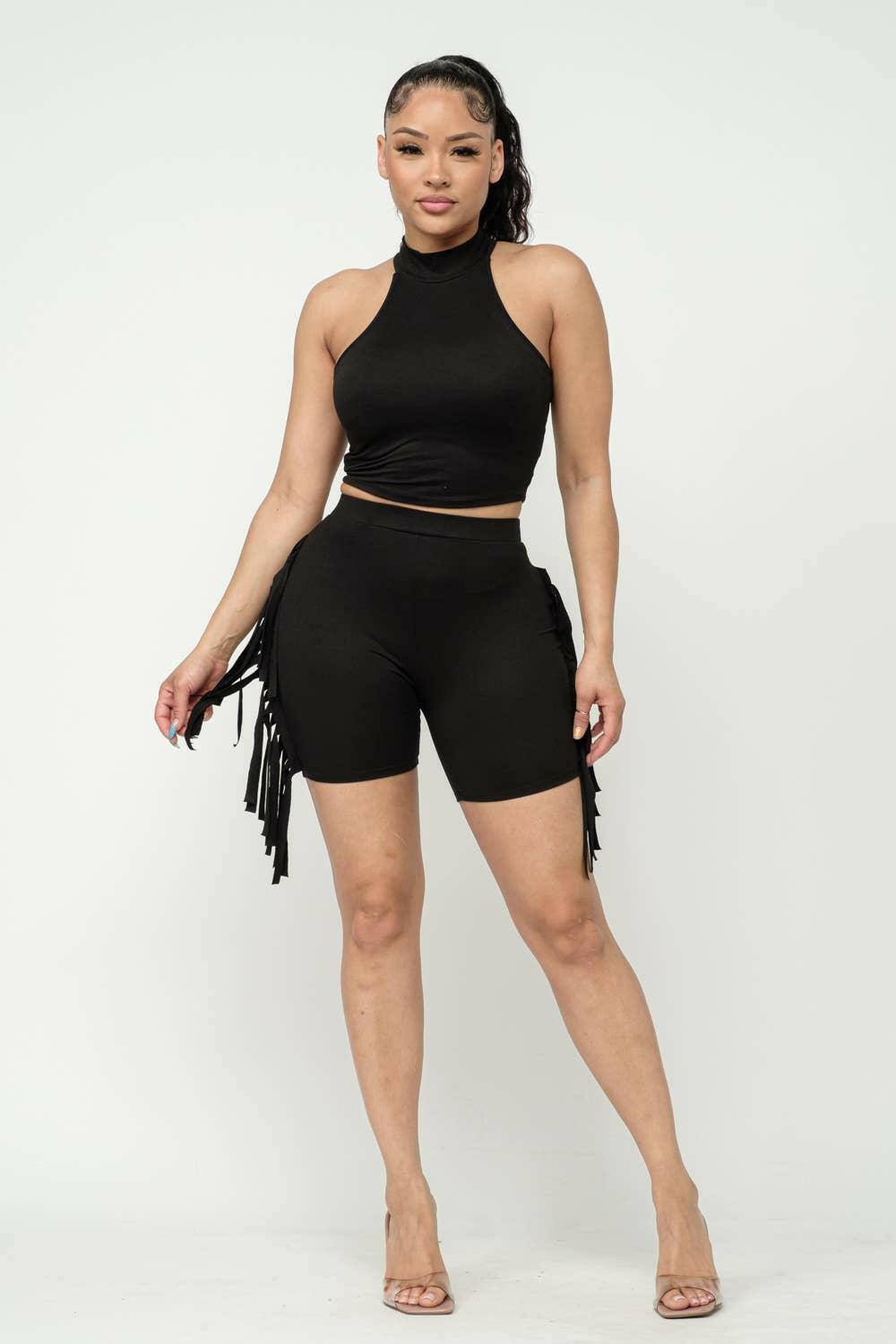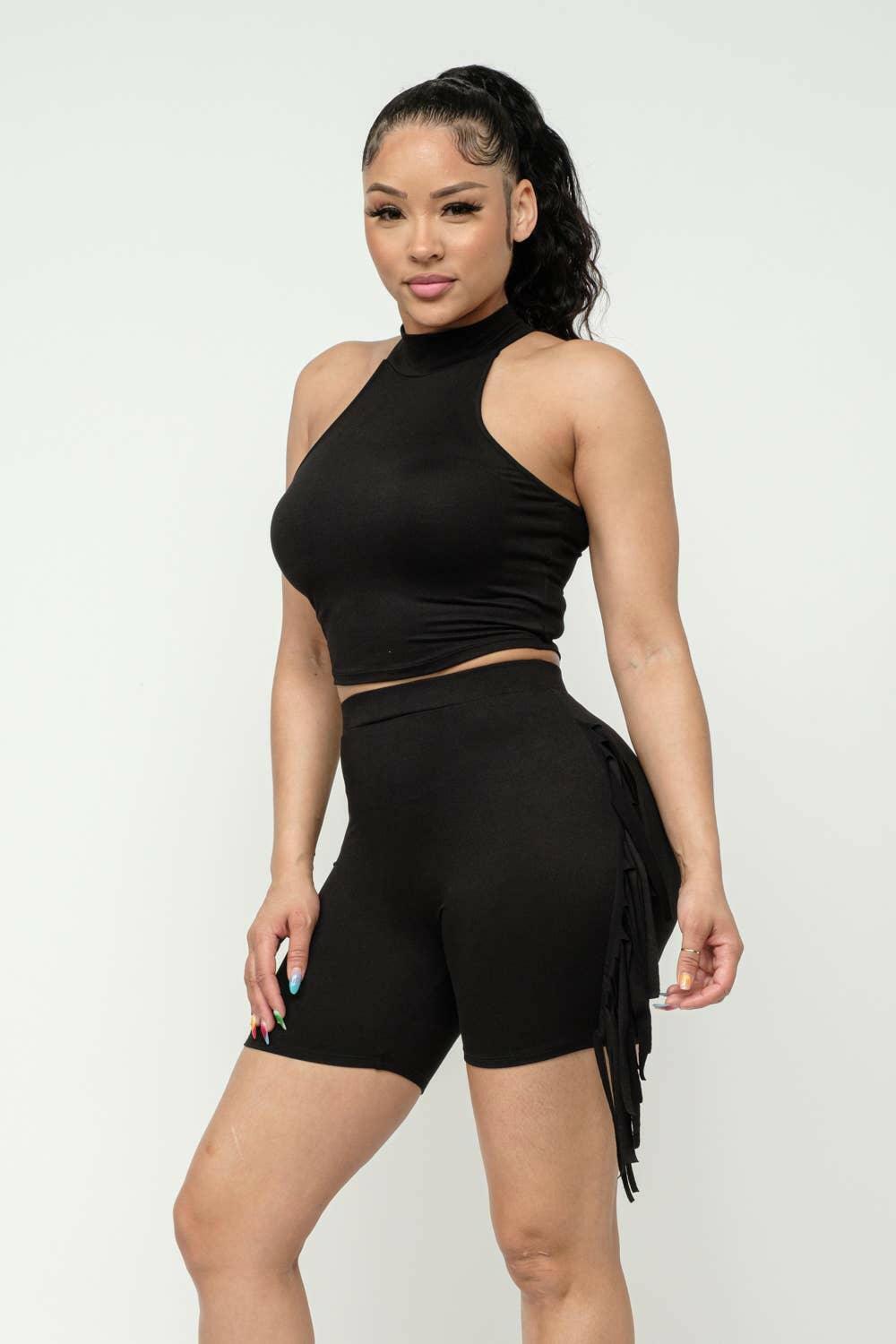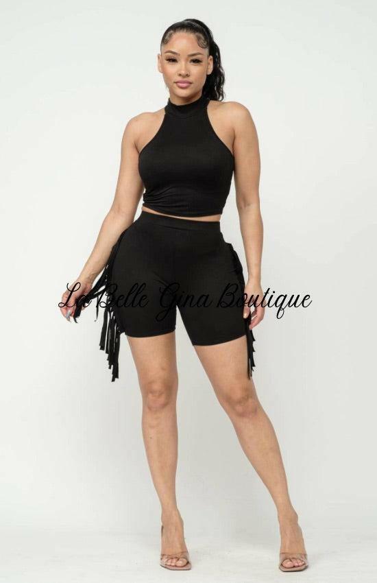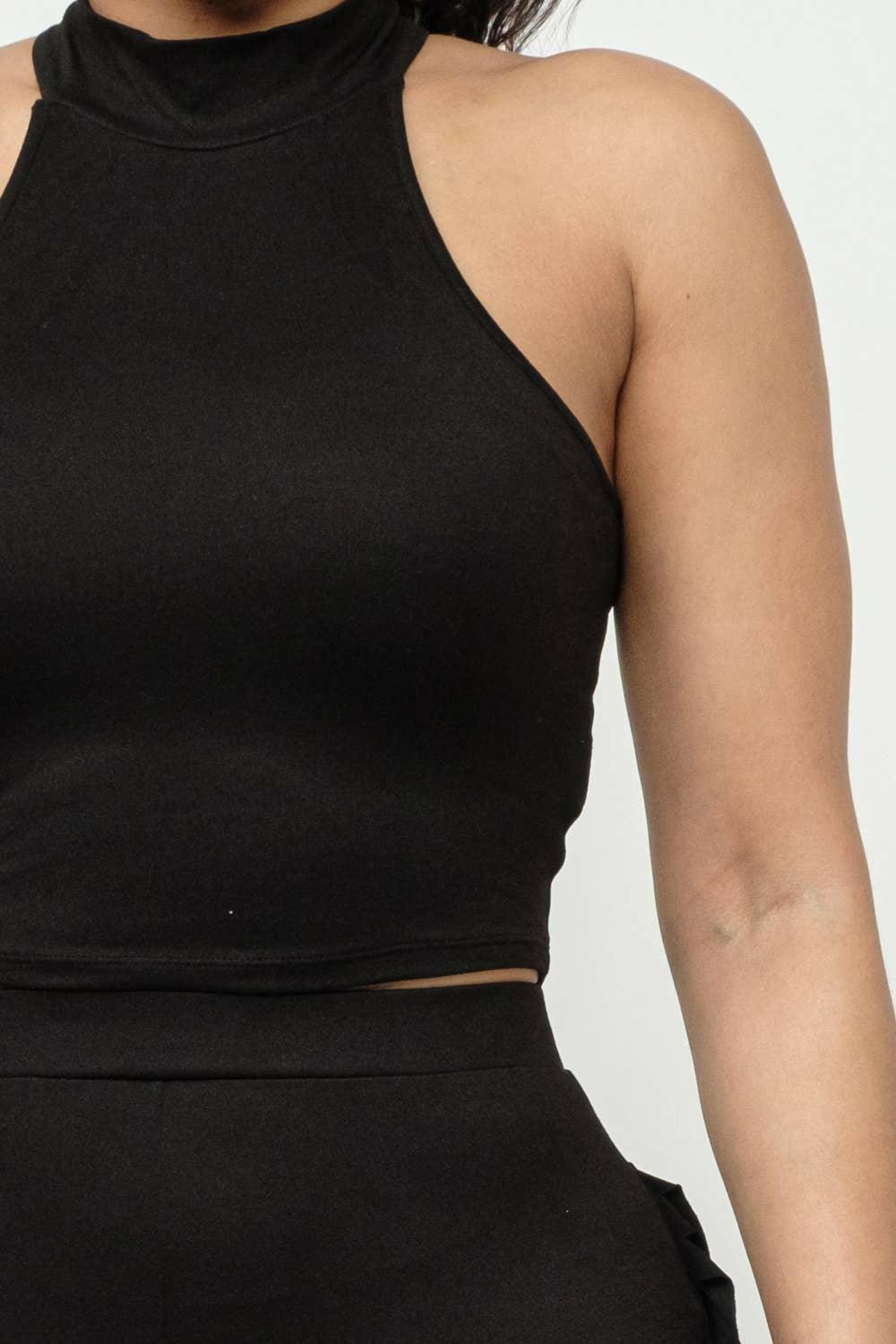 Nellie Mock Neck Crop Top And Side Laser Cut Short Set-Black - La Belle Gina Boutique