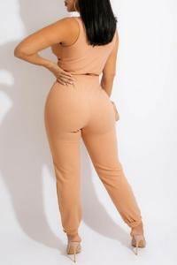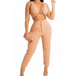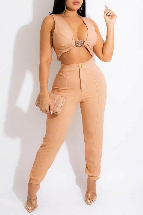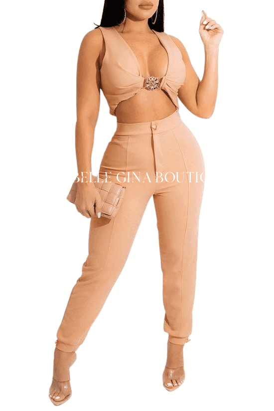 Serve confidence and style with this Nude Two-Piece Pants Set, designed for bold, fashion-forward women who love to stand out. This set features an eye-catching, plunging V-neck crop top with a dazzling jeweled front clasp. The soft nude fabric flatters many skin tones and provides a sophisticated yet sultry vibe. Pair it with heels or standout accessories to personalize your unique look.