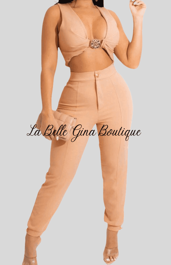 Nude Two-Piece Pants Set with Crop Top – Chic Women’s Outfit | La Belle Gina Boutique