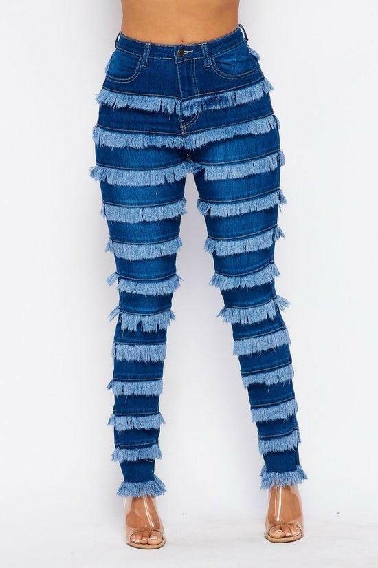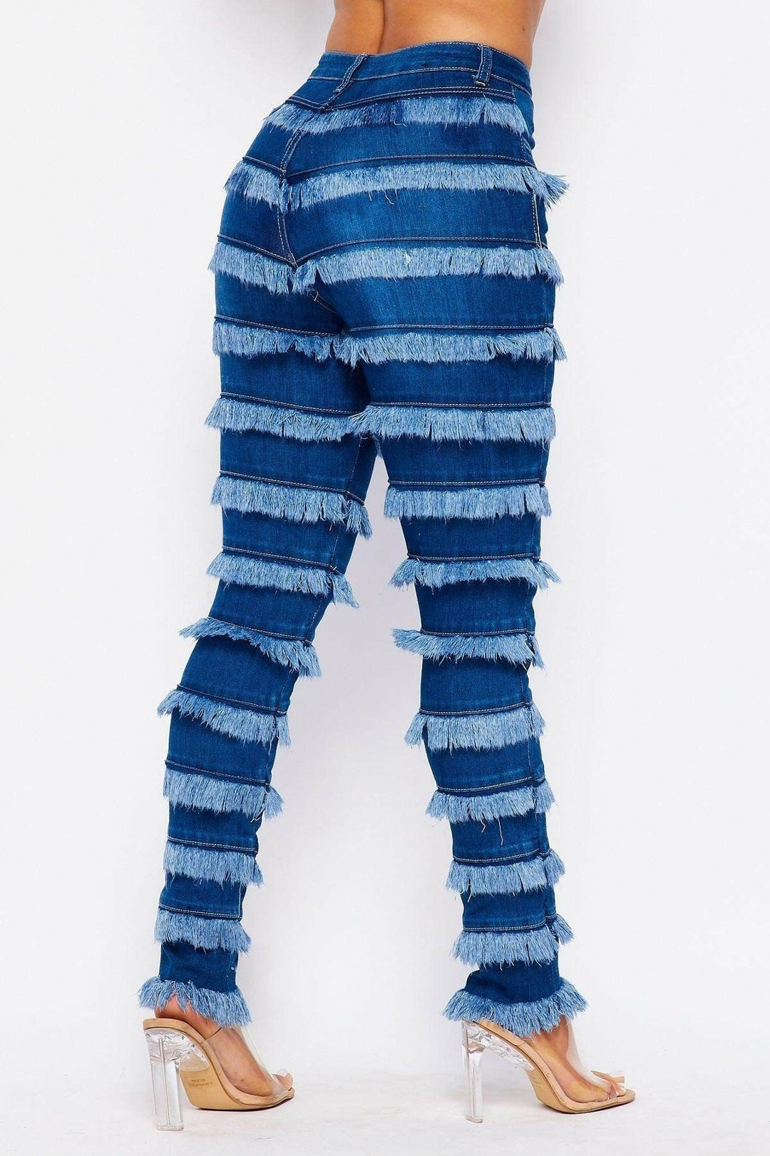 Step into standout fashion with our striking denim fringe jeans. These jeans are designed to elevate your wardrobe all year round. A modern twist on a timeless staple, they mix fresh energy with classic appeal. The intricate fringe detailing across every pair delivers subtle yet eye-catching movement. If you want jeans that combine comfort and expressive style, these are thoughtfully crafted for you. Enjoy making a statement with every outing—whether for daytime errands or evening get-togethers.