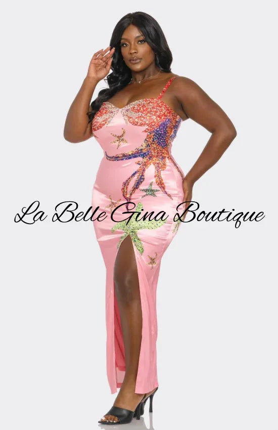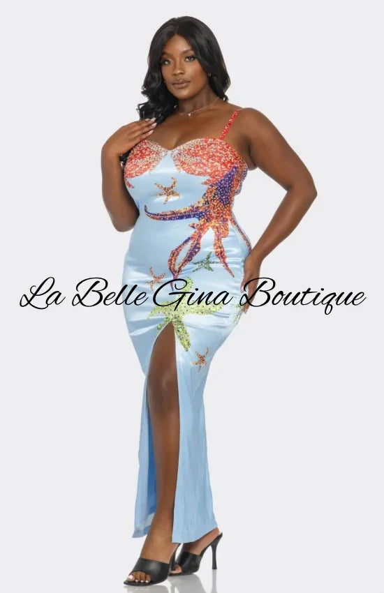 Striking floral and aquatic elements make this dress more than simple clothing—it is a form of wearable art. The design features a flattering silhouette for every shape. Creative accents set you apart from the crowd. The carefully chosen satin fabric feels soft on your skin, so you stay both comfortable and confident all night.