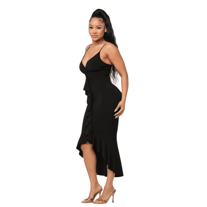 Saly Front Deep V-Neck Wrap Ruffle Detail Bottom Hem Adjustable Strap Midi Dress