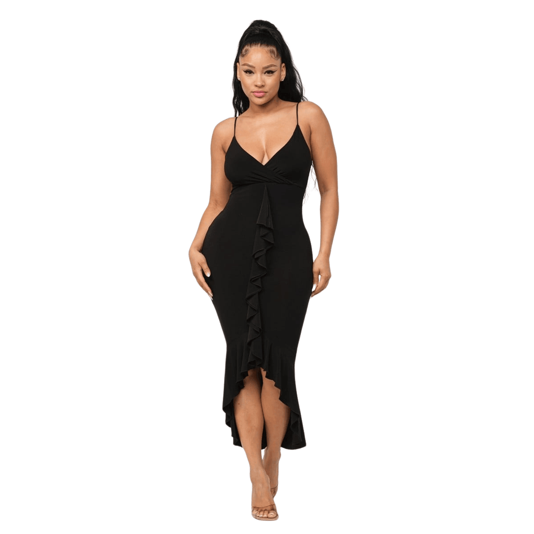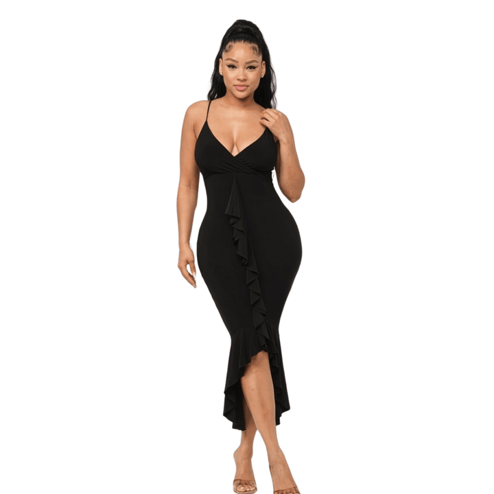 Saly Front Deep V-Neck Wrap Ruffle Detail Bottom Hem Adjustable Strap Midi Dress.