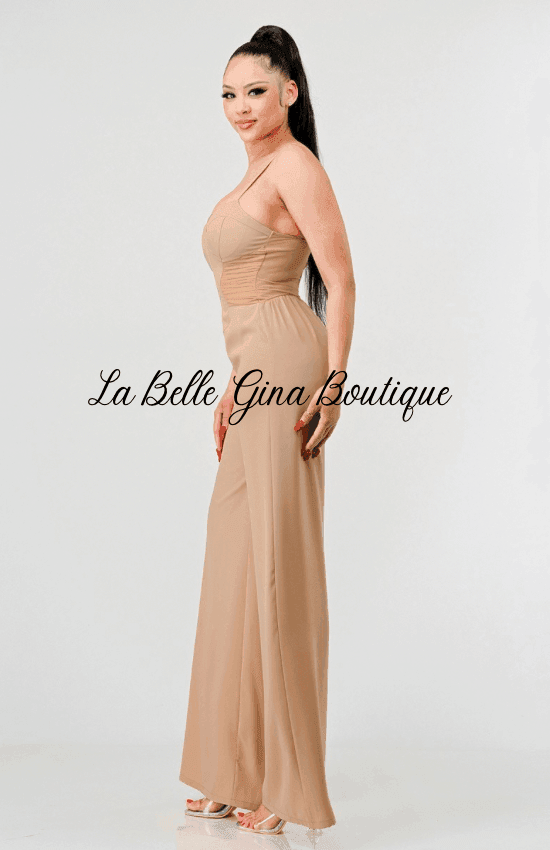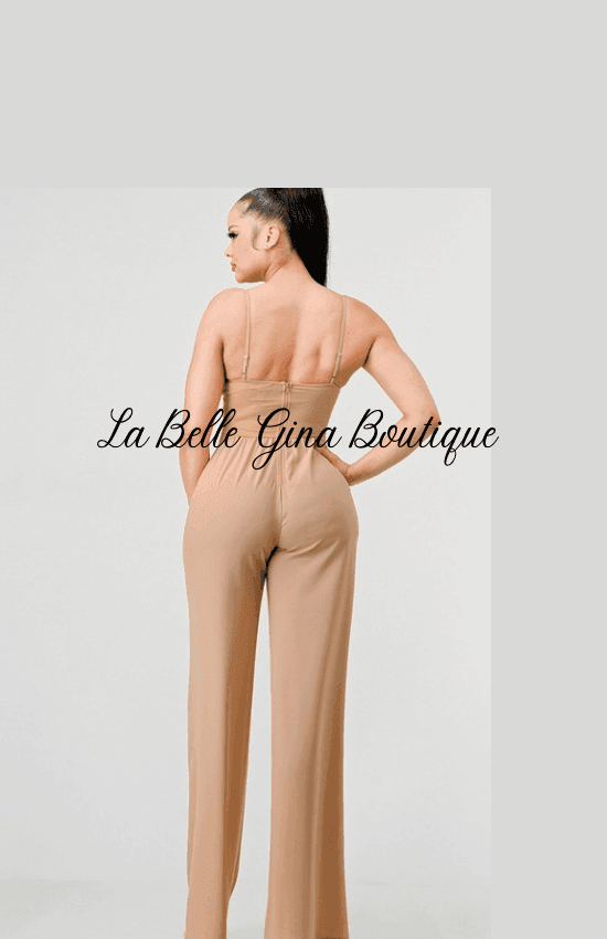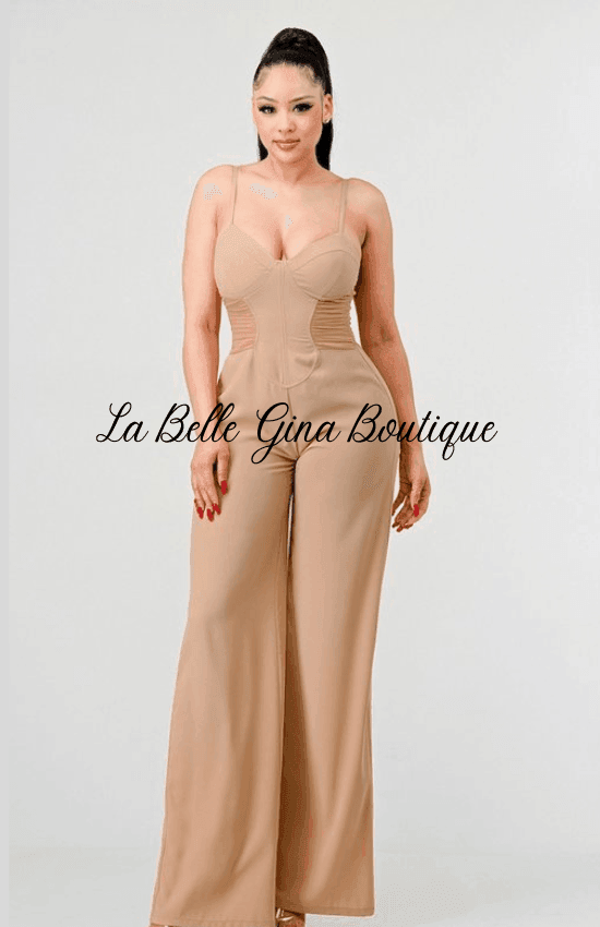 Sandia Chic Silky Dobby Sweetheart side Mesh Jumpsuit-Taupe