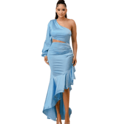 Featuring a unique one-shoulder design with a diagonal ruffle detail, this dress is guaranteed to turn heads wherever you go. The front cutout adds a touch of allure, while the ruffle details along the hemline provide a feminine and playful touch.