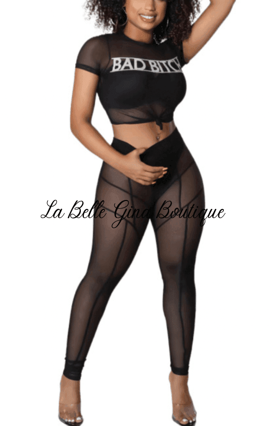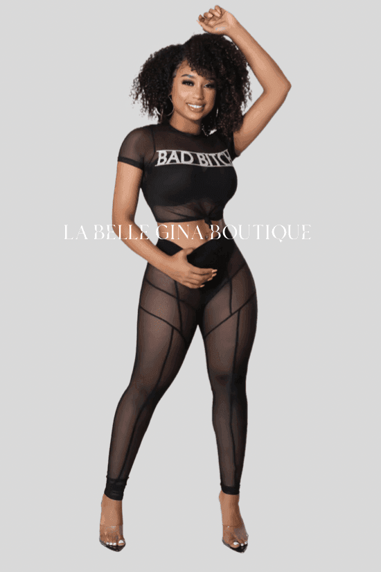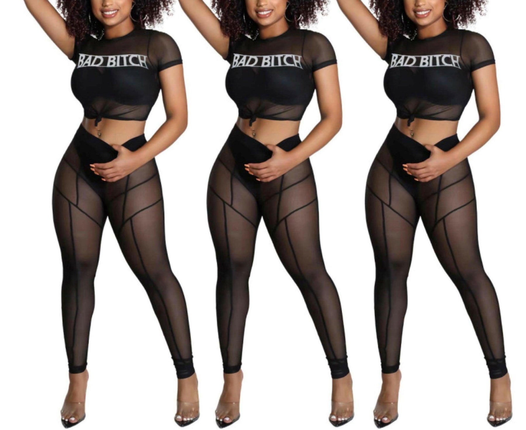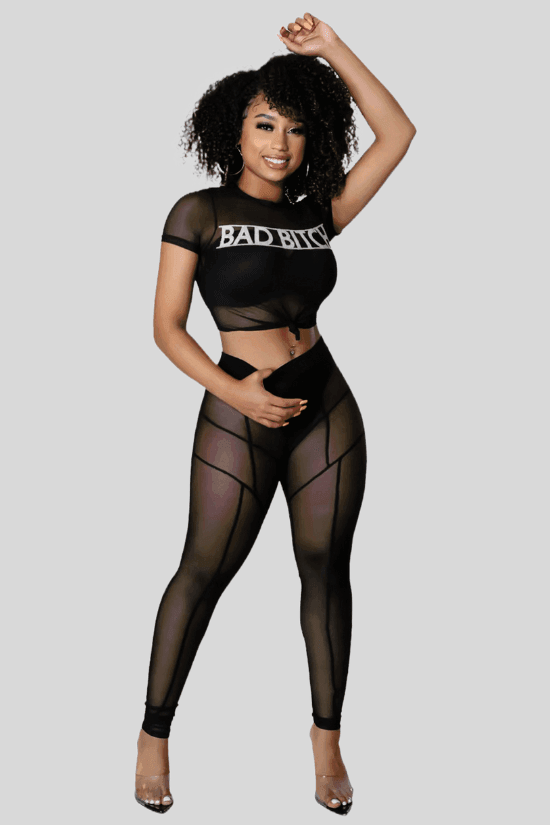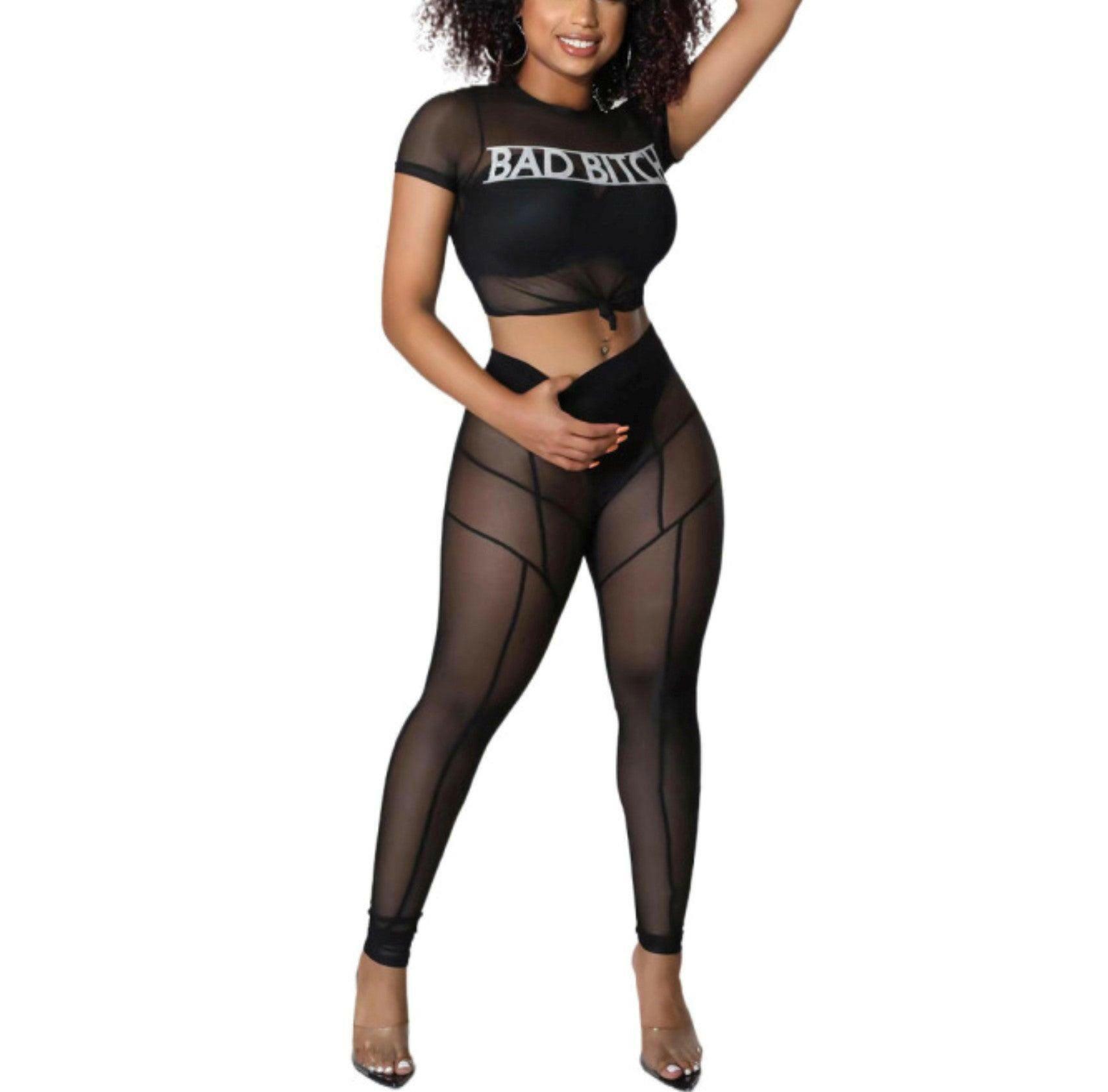 The cropped top in this set features trendy short sleeves and vibrant, bold lettering. Paired with form-fitting pants crafted from sheer mesh, the outfit is both alluring and breathable. Wear the pieces together for a coordinated look or style them separately—either way, you bring a dose of modern chic to your wardrobe.