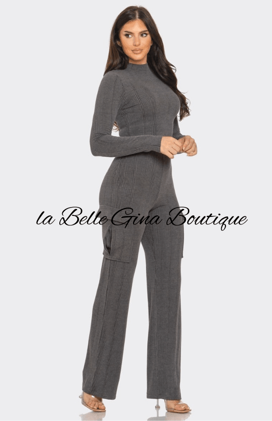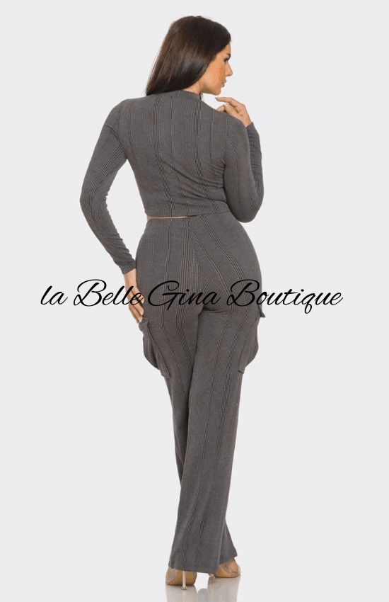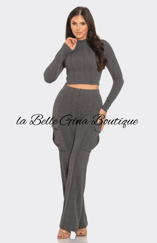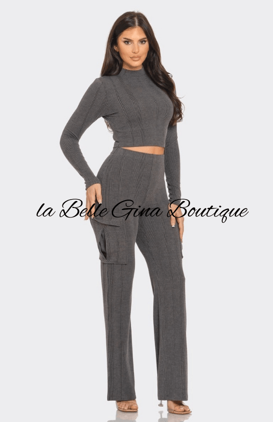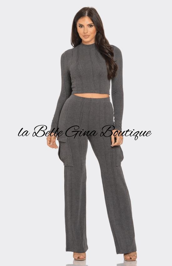 Introducing the Tiandra Rib Solid Mock Neck Long Sleeve Crop Top and Side Cargo Pockets Pants Set in Charcoal. This stylish ensemble combines comfort and functionality, perfect for any casual outing. The mock neck crop top provides a modern touch, while the side cargo pockets on the pants offer practical storage for your essentials. Crafted from high-quality ribbed fabric, this set ensures all-day comfort and a flattering fit. Elevate your wardrobe with this versatile and chic set, ideal for layering or wearing on its own.