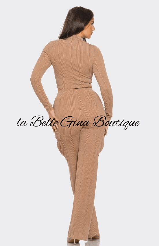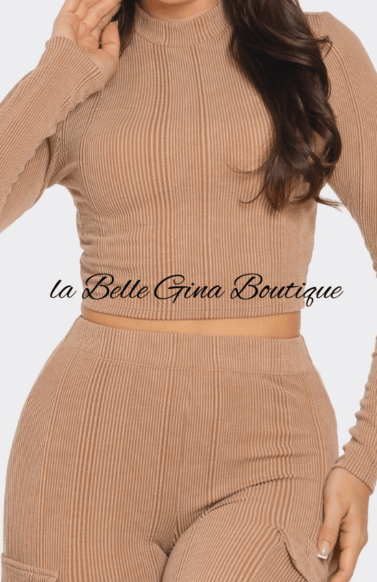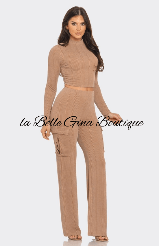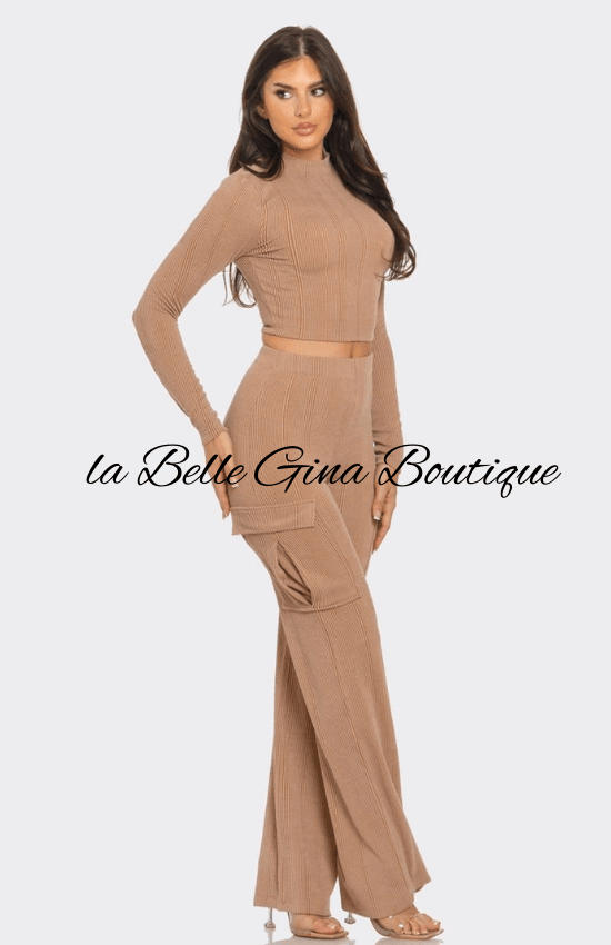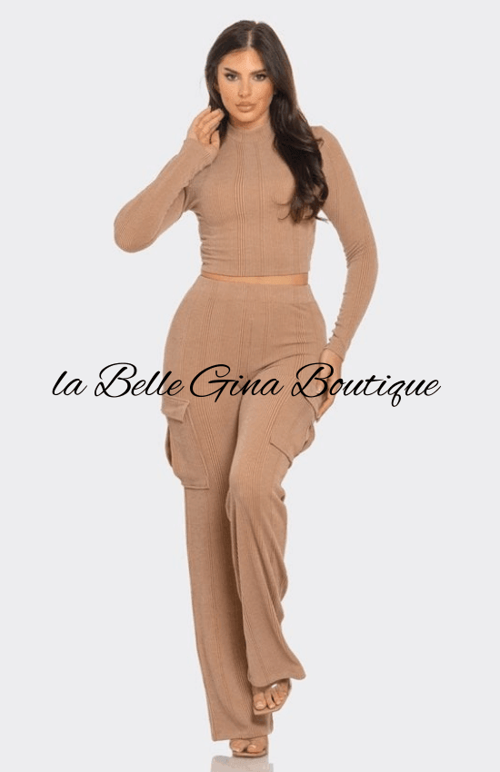 Tiandra Rib Solid Mock Neck Long Sleeve Crop Top and Side Cargo Pockets Pants Set-Mocha