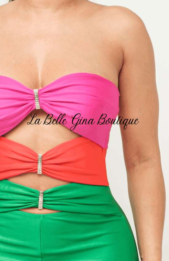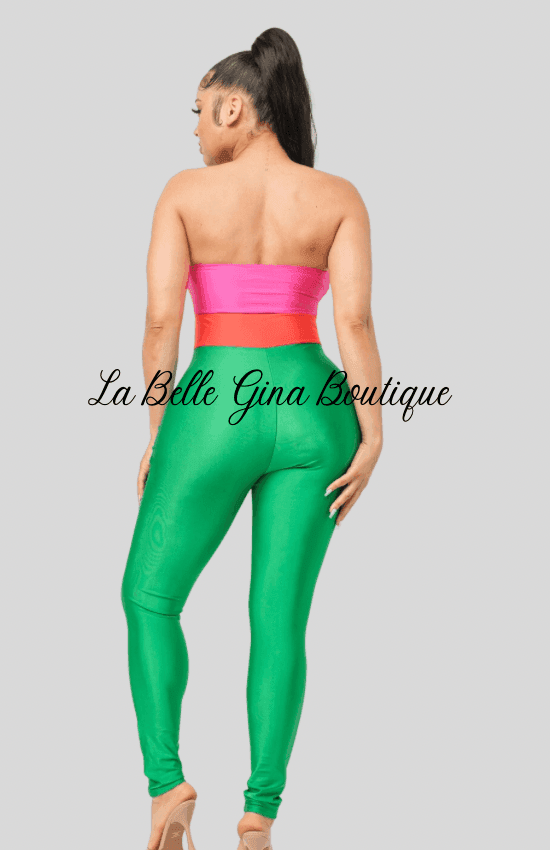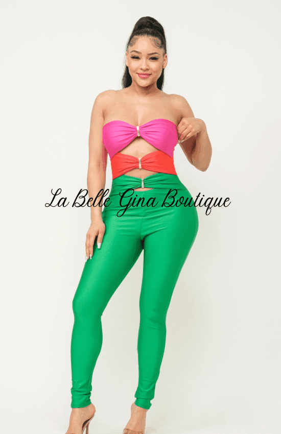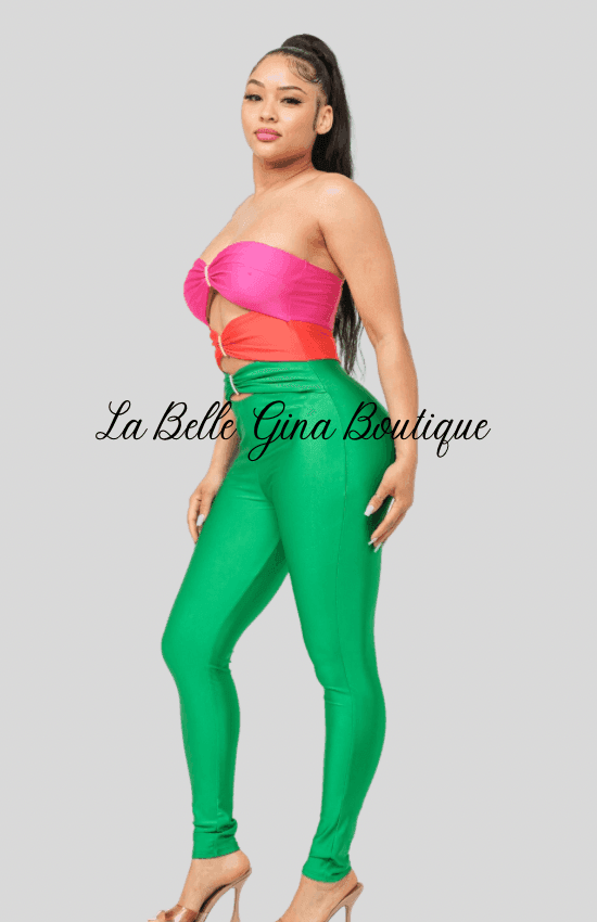 Introducing our stunning Vena Color Block Front Shirring Cut Out Rings Jumpsuit in Green Combo! This jumpsuit is the epitome of chic and versatile fashion. Whether you're attending a special event, going on a date, or simply want to make a stylish statement, this jumpsuit is the perfect choice. Crafted with meticulous attention to detail, this bra wrap jumpsuit features a unique front shirring design that adds a touch of elegance and sophistication. The cut-out rings on the waistline create a flattering silhouette, accentuating your curves in all the right places. Designed for both comfort and style, this jumpsuit is made from high-quality materials that feel incredibly soft against your skin. The sleeveless design and off-shoulder neckline exude a sense of femininity, while the long length adds an element of glamour. Whether you're pairing it with heels for a formal occasion or dressing it down with sandals for a more casual look, this jumpsuit is incredibly versatile. Its vibrant green combo color block pattern adds a pop of color and makes a bold fashion statement. Step out with confidence and turn heads wherever you go in our Vena Color Block Front Shirring Cut Out Rings Jumpsuit. Embrace your unique style and let this jumpsuit be your go-to fashion piece for any occasion. Add it to your collection today and elevate your wardrobe to new heights of style and sophistication.
